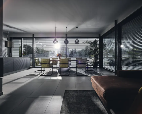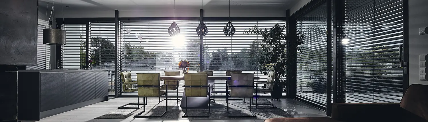 Mit Raffstoren vom ROMA verpassen Sie nicht nur Ihrer Glasfassade ein modernes Detail – auch Ihre Raumatmosphäre lässt sich mit den extrem langlebigen Aluminiumlamellen kreativ gestalten. Sehen Sie Sonnenstrahlen doch einfach wie Einrichtungsgegenstände. Oder testen Sie Ihre Einrichtung in verschiedenen Stimmungen. So wird Licht zum Gestaltungselement.