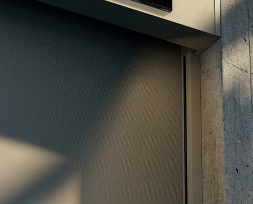 Wetterfest, pflegeleicht und mit moderner Optik fügen sich ROMA Textilscreens harmonisch in jede Fassade ein.